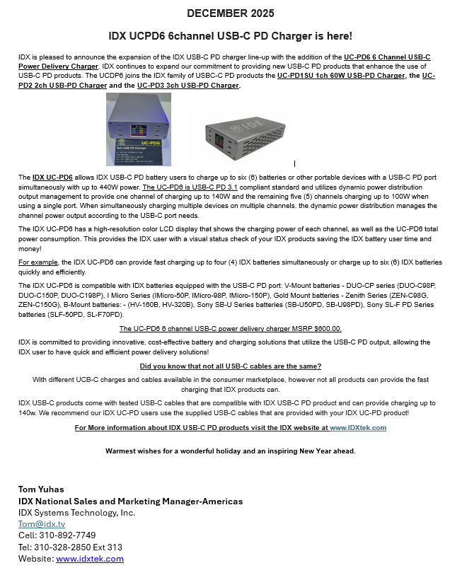 NEWS LETTER- December 2025 Posted by Tom Yuhas on 26th Mar 2026 #IDX UCPD6 6channel USB-C PD Charger is here! Facebook Email Print Twitter Pinterest